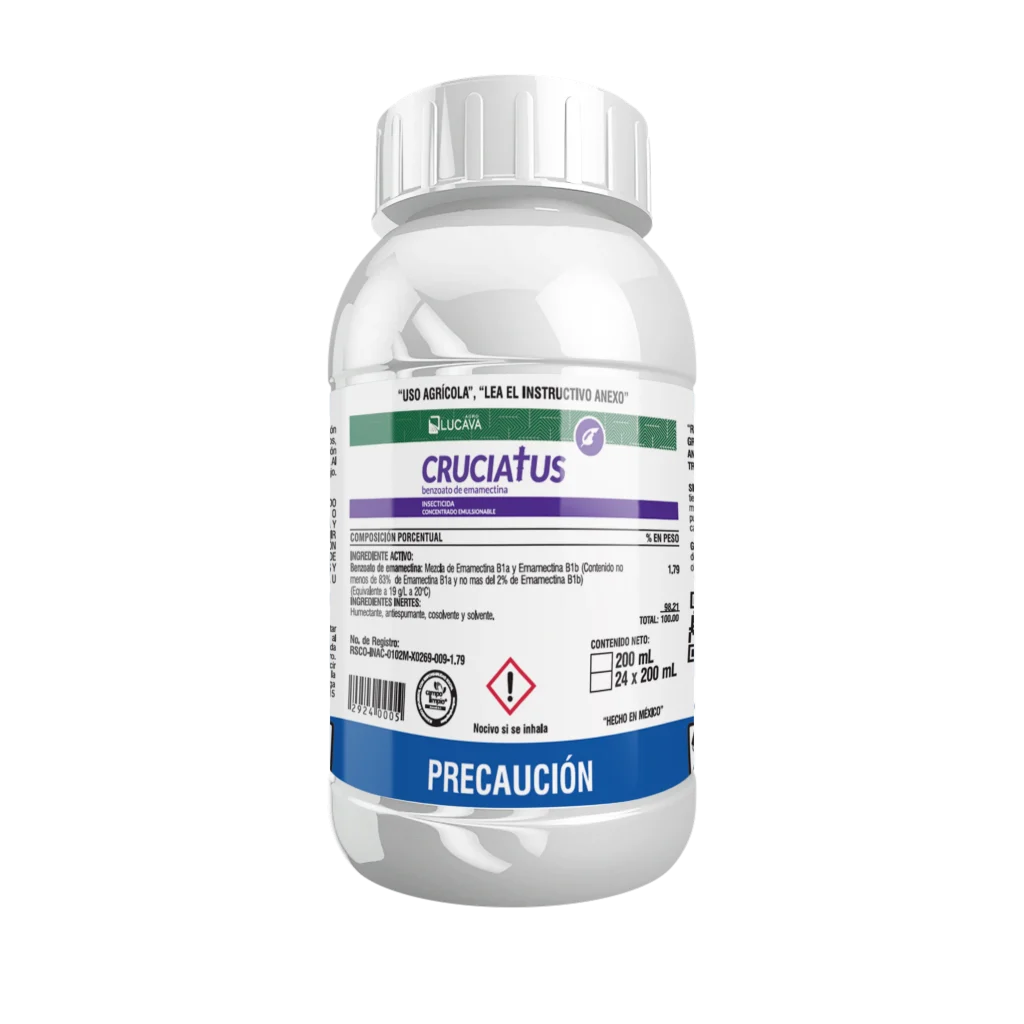 Calibre el equipo de aplicación y determine el volumen de agua necesario para cubrir perfectamente el área a tratar. Llene el tanque de aplicación hasta ¾ partes de la cantidad total de agua a utilizar. Con ayuda de una probeta mida la cantidad de CRUCIATUS, a utilizar y vierta en un recipiente limpio por separado para realizar una premezcla, agite utilizando un agitador mecánico (nunca con las manos) hasta mezclar perfectamente. Vierta la premezcla en el tanque del equipo de aplicación o aspersor, agregue la cantidad de agua faltante, cierre el tanque completamente y agite hasta mezclar perfectamente.