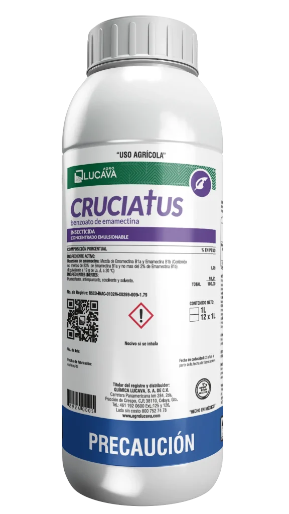 Calibre el equipo de aplicación y determine el volumen de agua necesario para cubrir perfectamente el área a tratar. Llene el tanque de aplicación hasta ¾ partes de la cantidad total de agua a utilizar. Con ayuda de una probeta mida la cantidad de CRUCIATUS, a utilizar y vierta en un recipiente limpio por separado para realizar una premezcla, agite utilizando un agitador mecánico (nunca con las manos) hasta mezclar perfectamente. Vierta la premezcla en el tanque del equipo de aplicación o aspersor, agregue la cantidad de agua faltante, cierre el tanque completamente y agite hasta mezclar perfectamente.